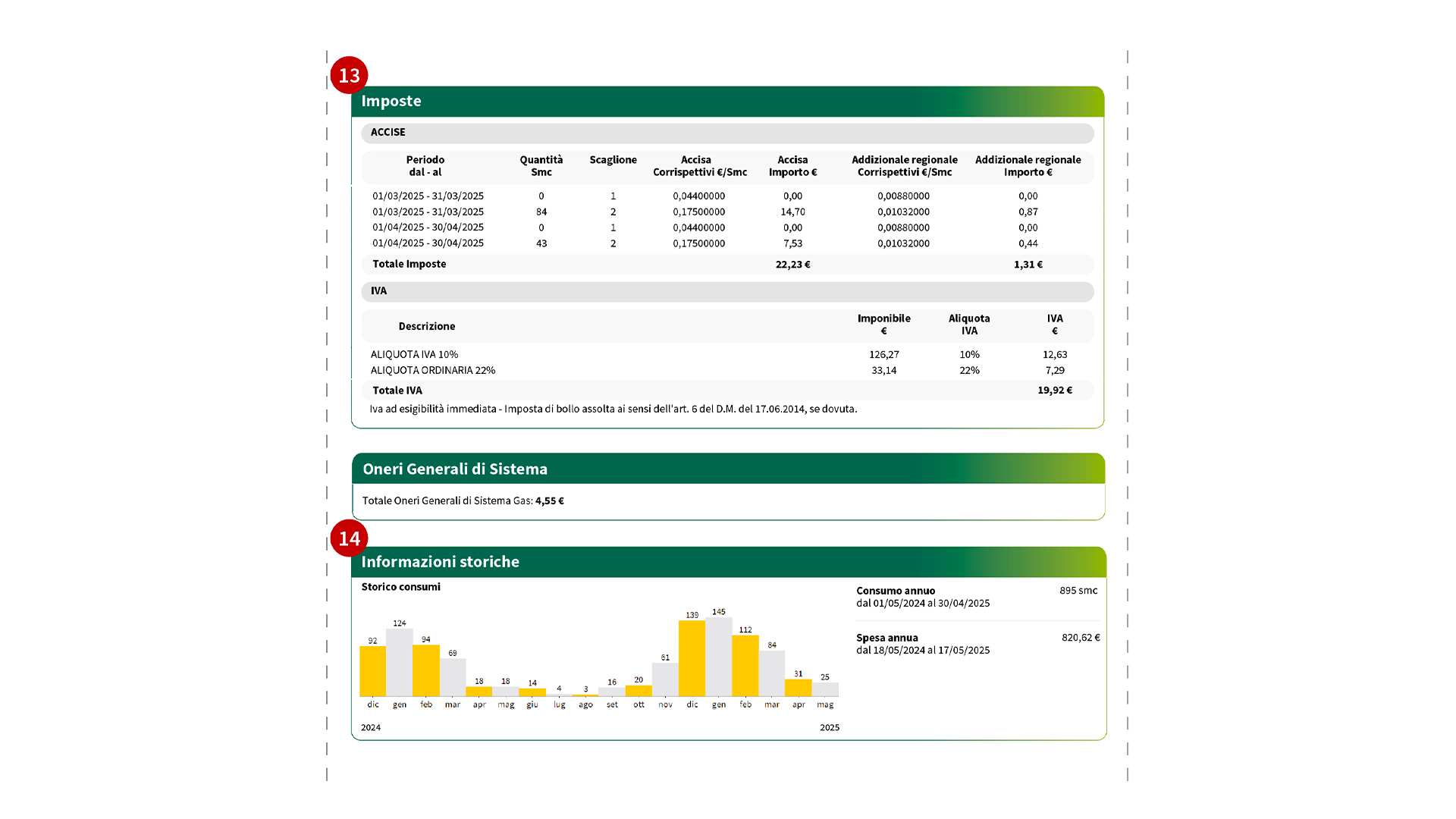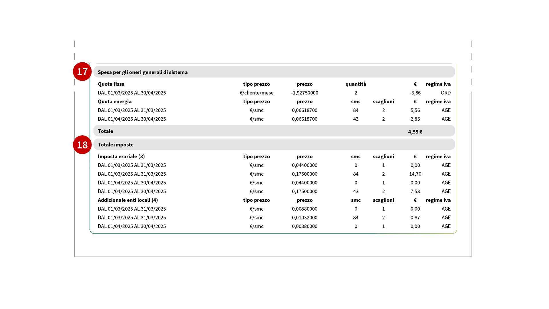 8. Uno schema semplificato degli importi fatturati aggregati secondo una struttura quantità x prezzo medio, distinguendo tra Quota per consumi e Quota fissa e, solo per il settore elettrico, Quota potenza. All'interno della singola voce di aggregazione, la Spesa per la vendita di energia elettrica è determinata in base ai corrispettivi di vendita previsti dal tuo contratto, mentre la Spesa per la rete e gli oneri generali di sistema è definita dall'ARERA, e comprende gli importi per le attività di trasporto, di distribuzione locale e di misura.