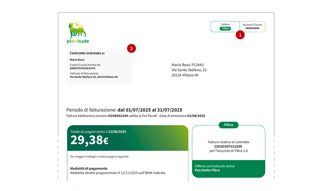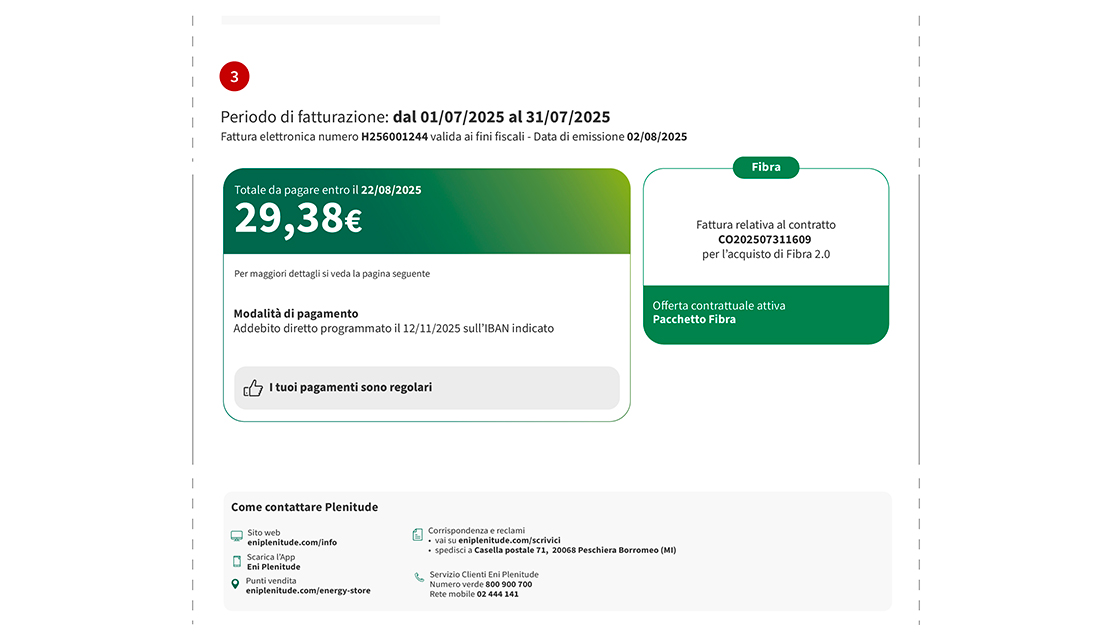 3. Subito sotto sono riportati il periodo di fatturazione, il numero della fattura e la data di emissione. Per il pagamento delle bollette, Plenitude mette a disposizione diversi metodi, dalla domiciliazione al pagamento online con carta di credito. Nel caso in cui siano presenti importi a credito, questi vengono indicati nella sezione dedicata ai consumi. Per motivi contabili, l’importo della fattura viene azzerato. Il credito può essere utilizzato per saldare le fatture successive, compensare eventuali fatture non pagate oppure, in caso di cessazione della fornitura o su richiesta del cliente, essere rimborsato. Viene inoltre indicato se i tuoi pagamenti risultano regolari e lo stato della tua offerta.